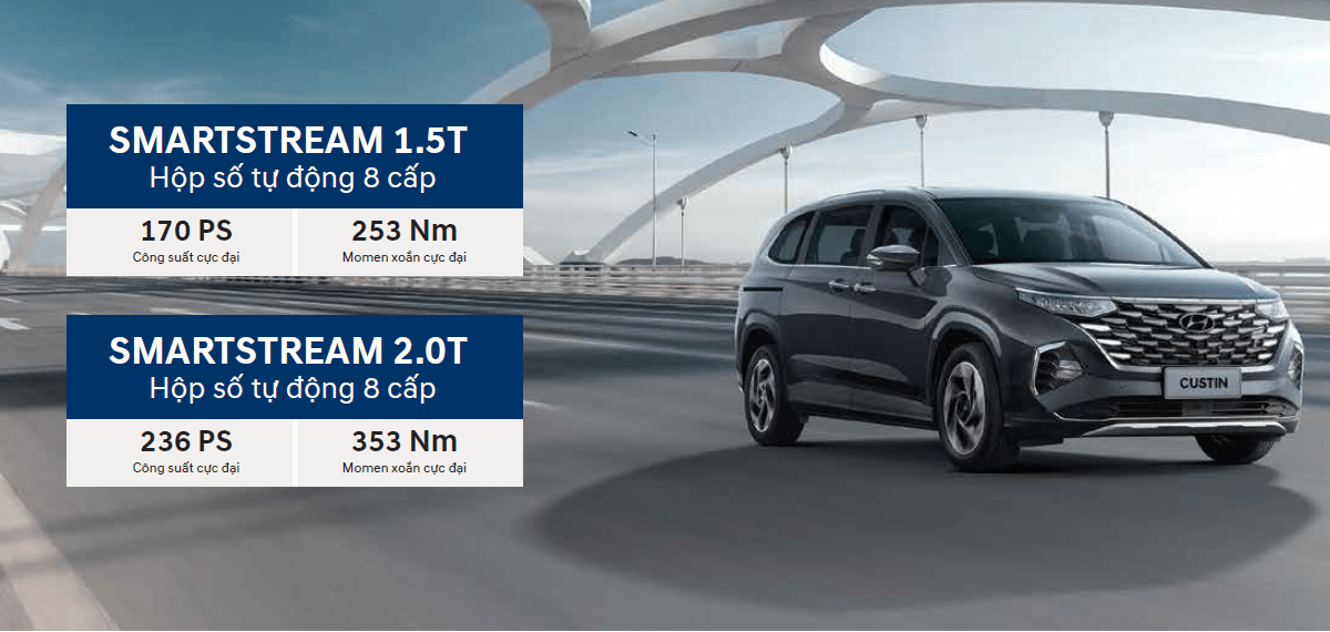 Hyundai Custin vận hành mạnh mẽ và êm ái với 2 tùy chọn động cơ turbo Smartstream thế hệ mới 1.5T-GDI và 2.0 T-GDI